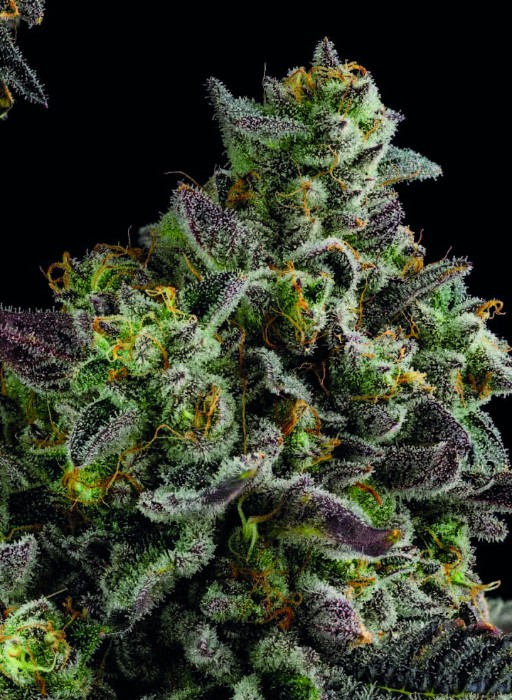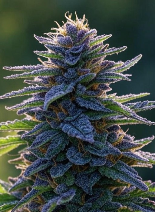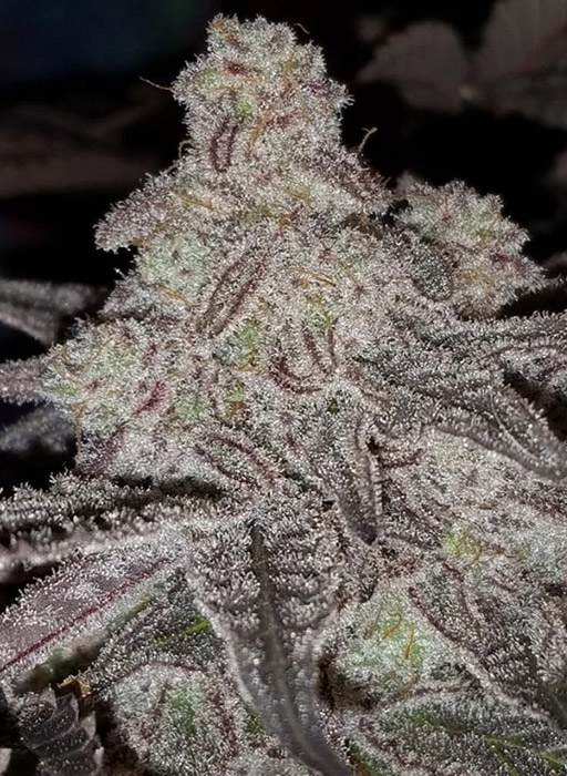 Appearance: Compact green buds with purple hints, orange hairs, and heavy trichome coverage
